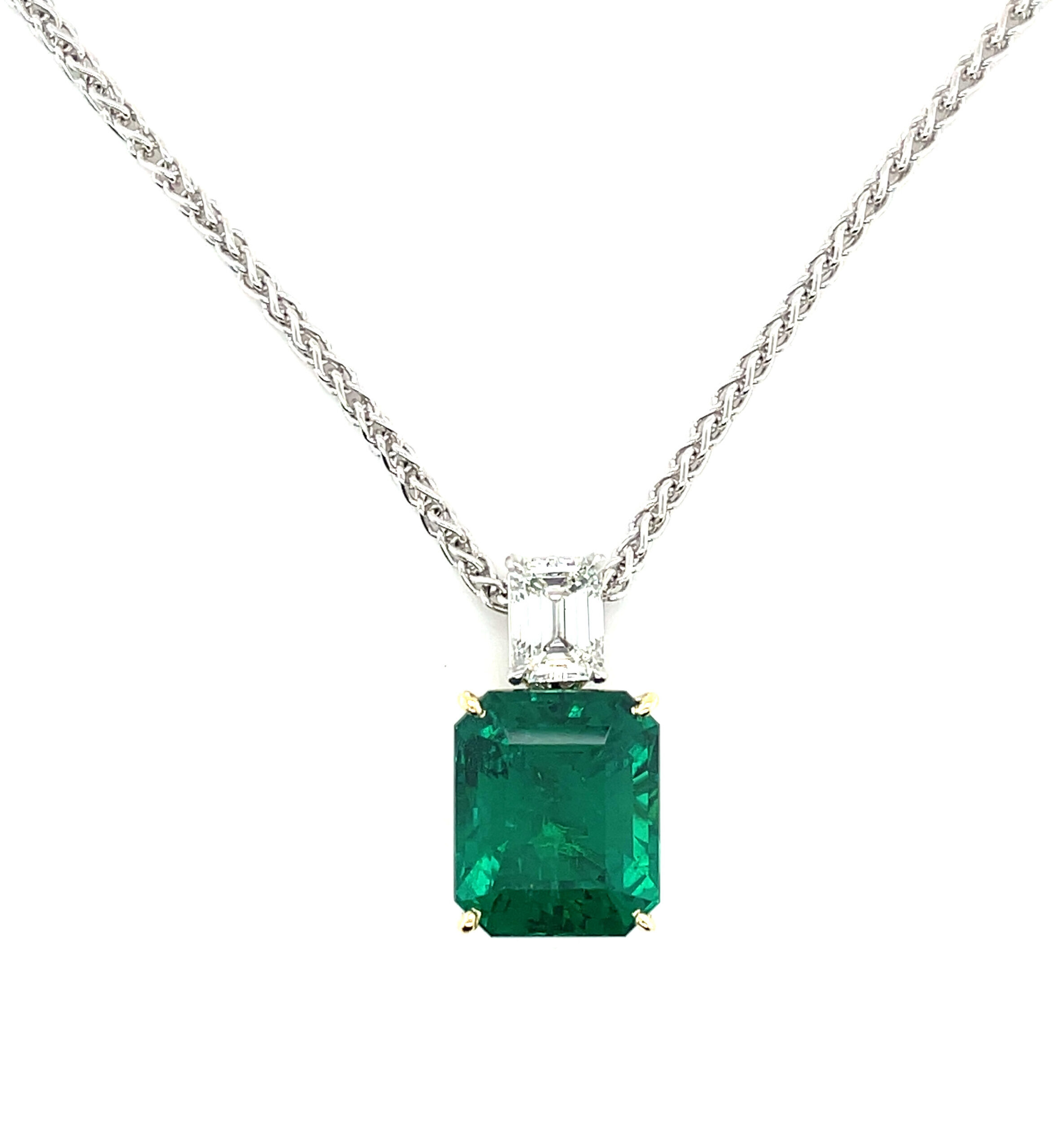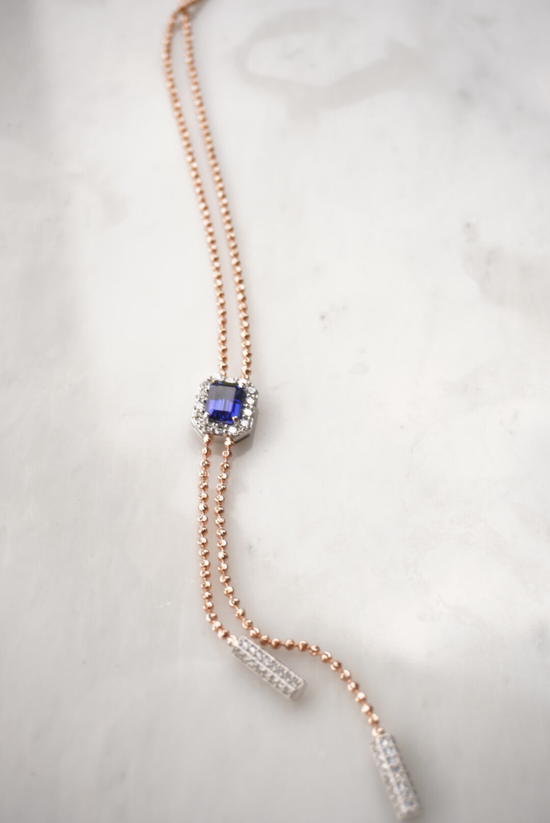 18 Karat Rose Gold Diamond Cut Moon Chain with an Emerald Cut Sapphire and Diamond Halo set in Platinum. Additionally, Diamond-Encrusted Aglets at the end of the Lariat are set in Platinum.