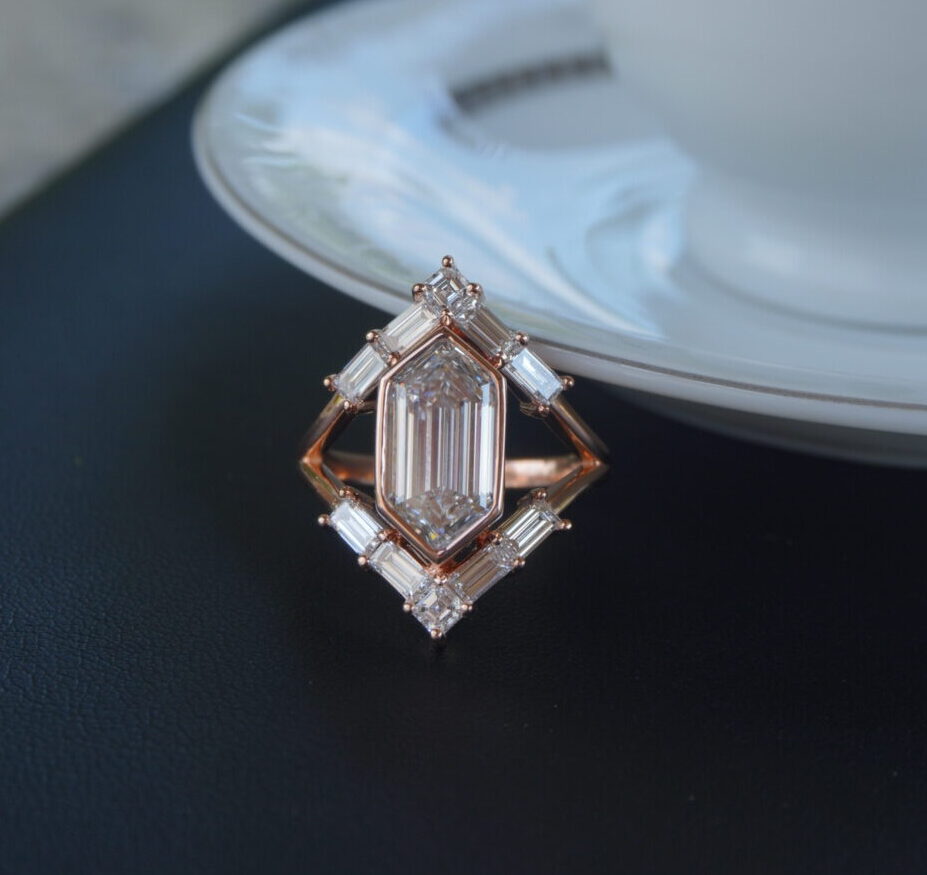 14 Karat Rose Gold Ring with an Elongated Hexagon Diamond Center. Additionally, with Baguette and Asher Cut Diamond Accents.