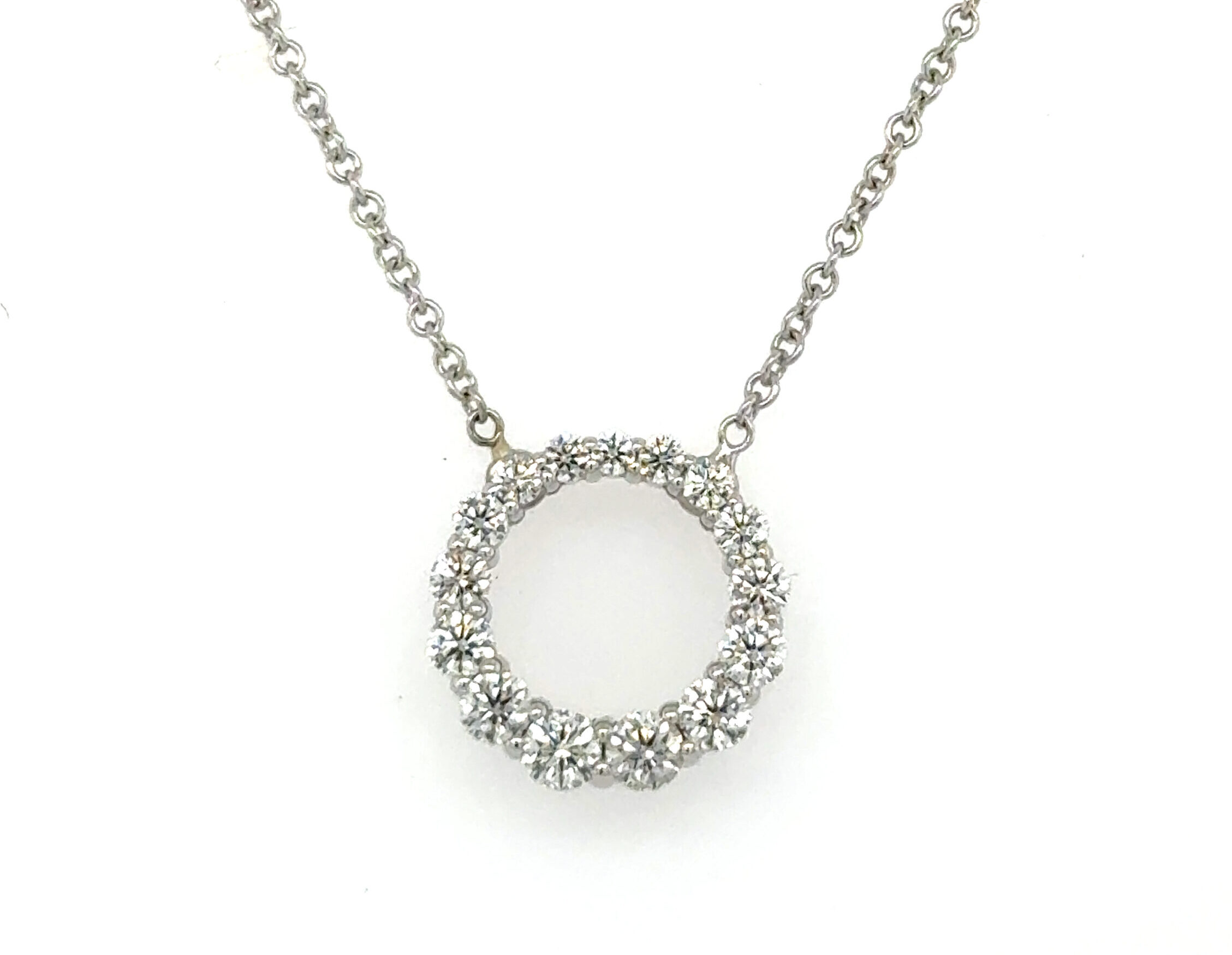 18 Karat White Gold HEARTS ON FIRE Whimsical Graduated Circle Pendant with 15 Round HEARTS ON FIRE Diamonds which weigh approx. 0.60 carats total weight.